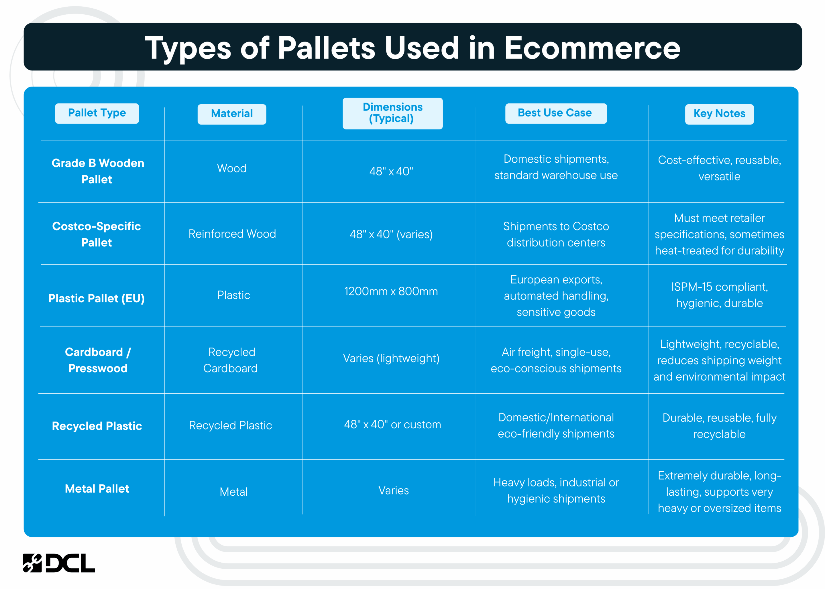 Sustainability is increasingly important in ecommerce logistics. Pallets made of recycled plastic, cardboard, or sustainably sourced wood help reduce environmental impact.